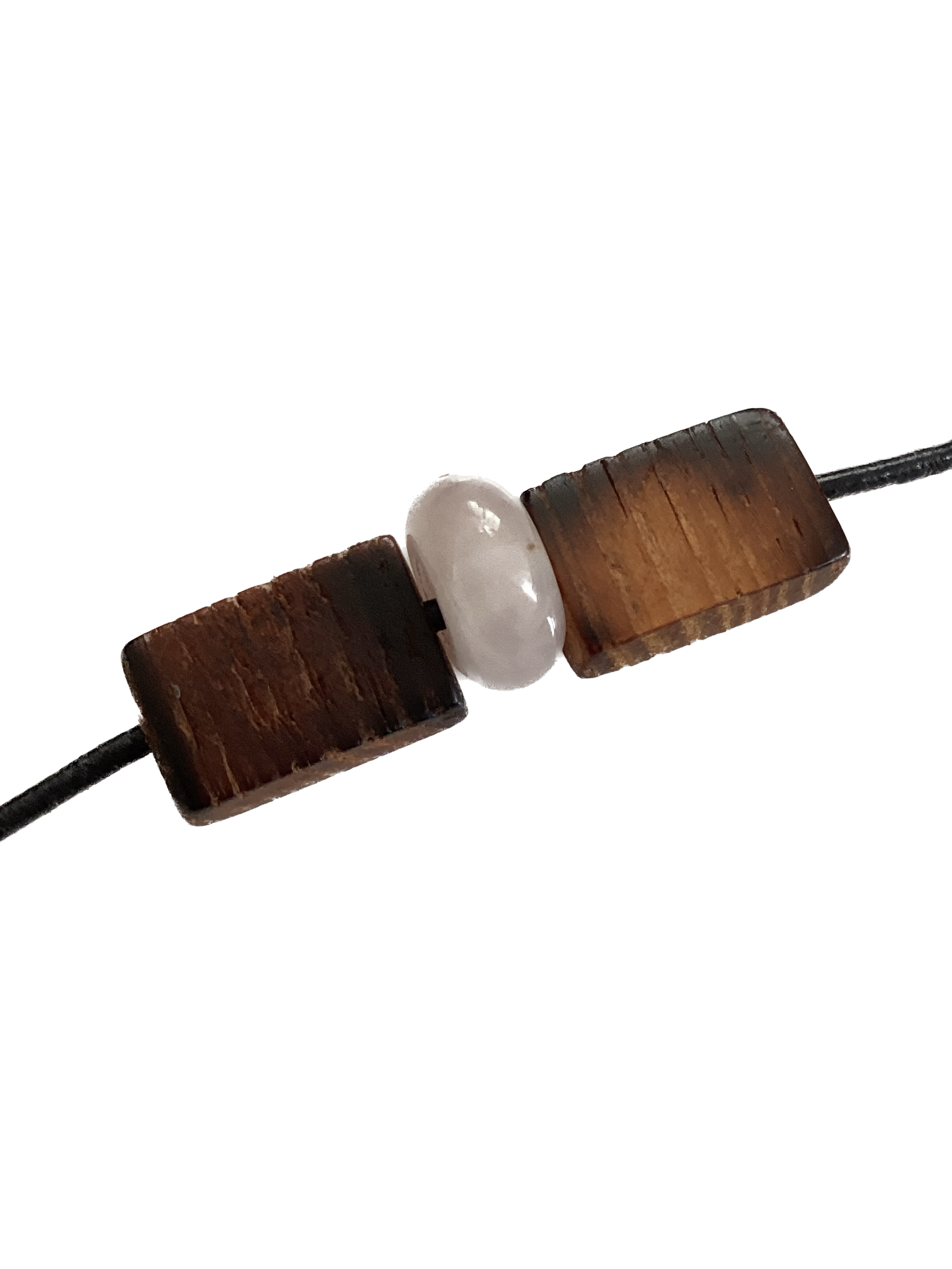 Exotic Wood Necklace No.3: Embrace serenity with the delicate charm of pale rose quartz.
